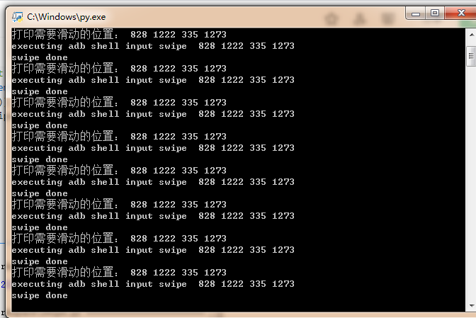 def swipe(fromX,fromY,toX,toY): print('打印需要滑动的位置:',fromX,fromY,toX,toY) dictParams=locals(); strSwipe='adb shell input swipe ' for k,v in dictParams.items(): strSwipe+=(' '+str(v)) print('executing '+strSwipe) os.system(strSwipe) print('swipe done')